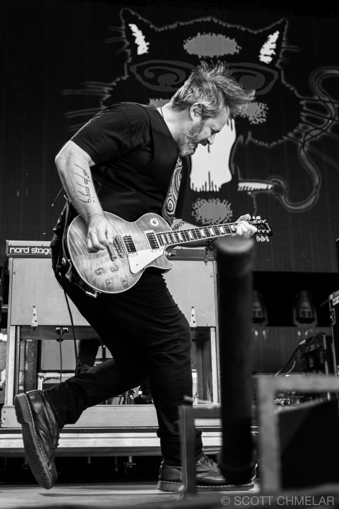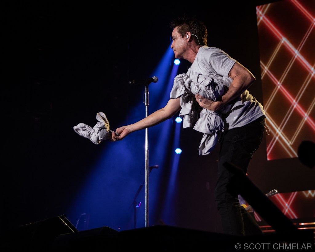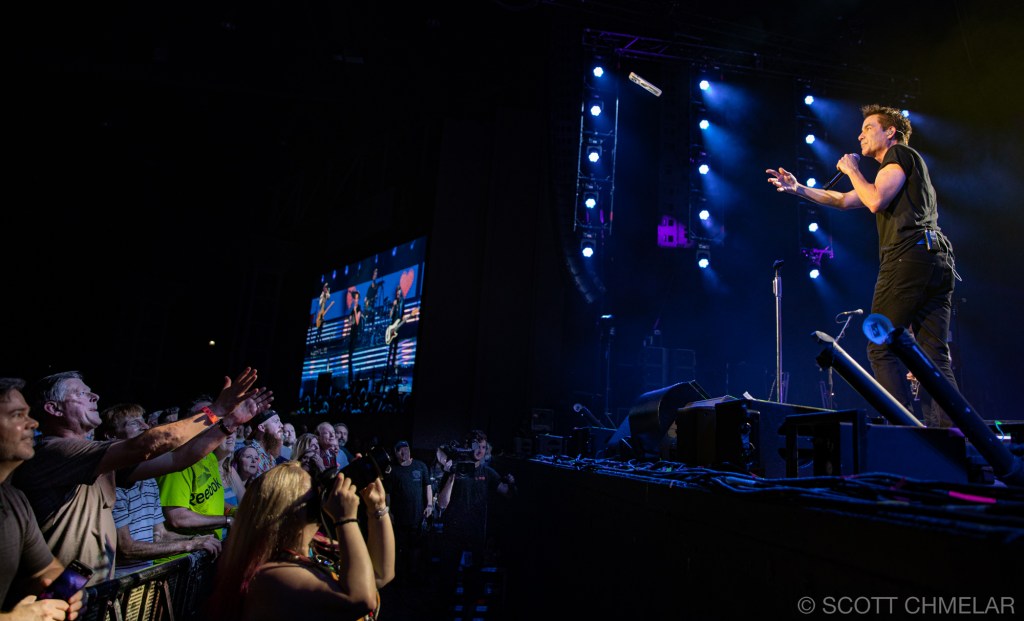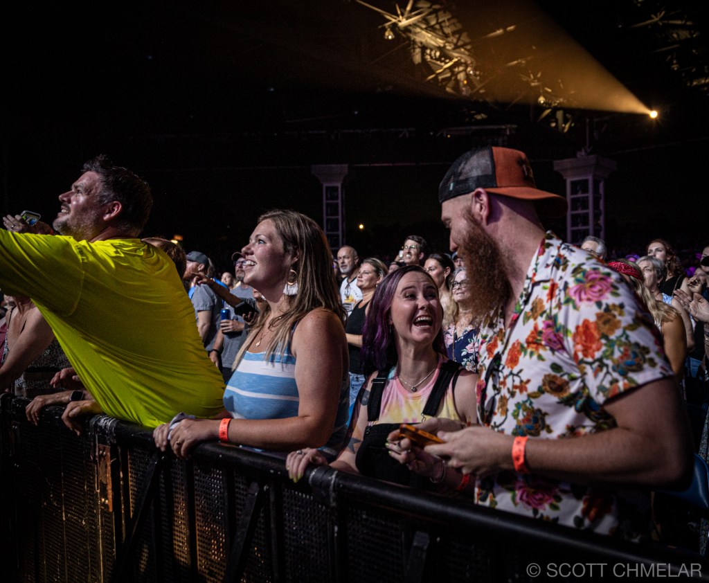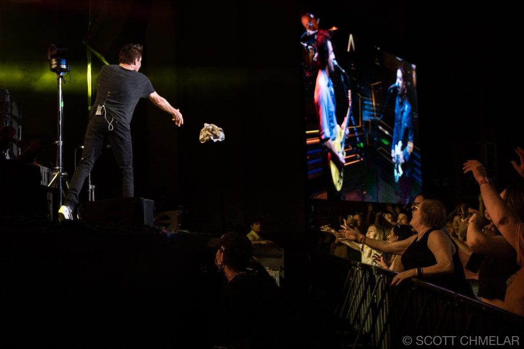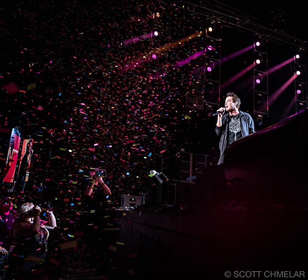 Most often music photographers are only given permission to photograph the first three songs from the the area right in front of the stage i.e.”The Pit”. The band knows we are there. After all, during their whole tour from city to city they see us Pesky Picture Parasites crawling all over each other to get a good snap. For the first three with Train, us bugs caught the terrific lead vocalist Pat Monahan, working twice as hard as a mere vocalist in not only singing the songs but working the whole stage front to back and side to side bonding big-time with the audience. The opening song blew out with a fun explosion of confetti, the second song Pat ran from musician to musician (still singing). getting his T-shirt signed then ripping it off and throwing it out to a lucky audience member, as well as several more shirts, and in the third, deftly caught fan’s cell phones (still singing!), being pitched to him from the fans, taking a selfie with a view of the owner of the phone, then accurately tossing the phone back to the fan. This guy is working the amphitheater hard, bonding the band with the fans. He’s awake…and he’s working his ass off. I hope all those that make a living off this band appreciates it.
