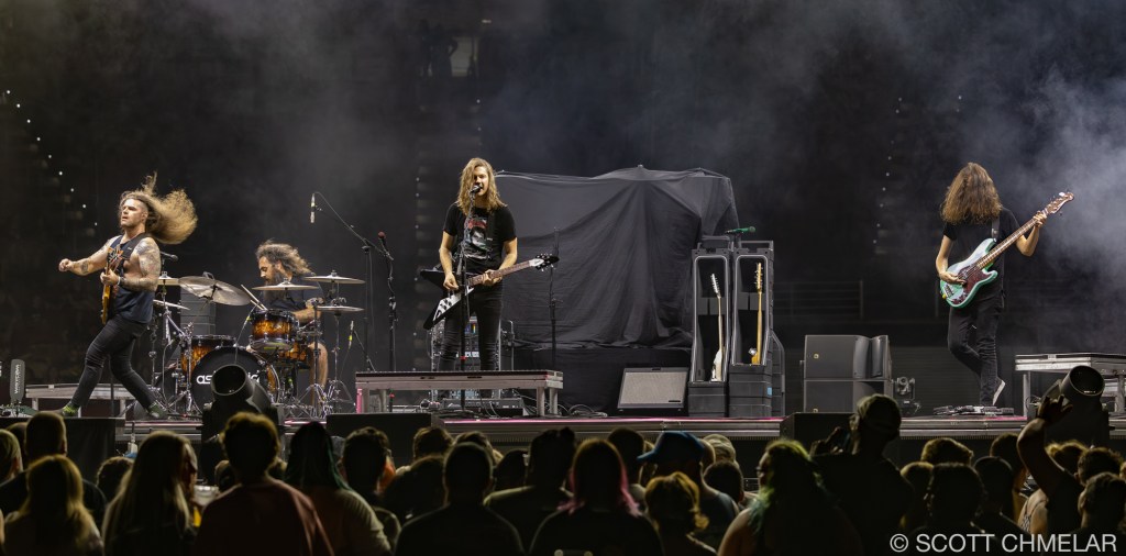 The night kicked off with Astronoid, the quintet from Lowell, Massachusetts, who brought their ethereal mix of shoegaze and metal to the stage like a meteor crashing into a dreamscape. Fronted by Brett Boland, with Daniel Schwartz on bass, Casey Aylward and Mike DeMellia shredding on guitars, and Matt St. Jean pounding the drums, they washed the crowd in layers of shimmering sound, somewhere between celestial and chaotic. Their latest album, Radiant Bloom, is a testament to their boundary-pushing ethos, a relentless barrage of beauty and noise that has solidified them as one of the most innovative acts in the metal-shoegaze realm. Their performance at PNC Arena was a wave of sonic euphoria, leaving the audience both dazed and enthralled. Check them out at astronoidband.com if you dare to take the plunge into their cosmic soundscapes.