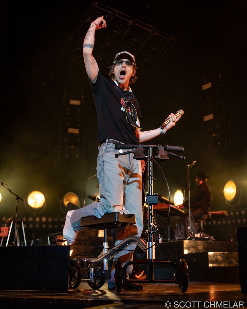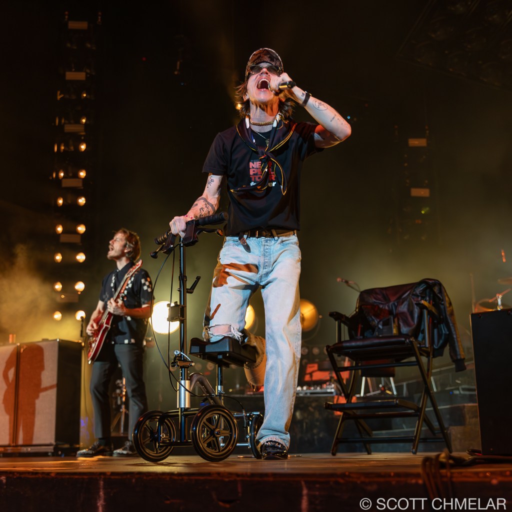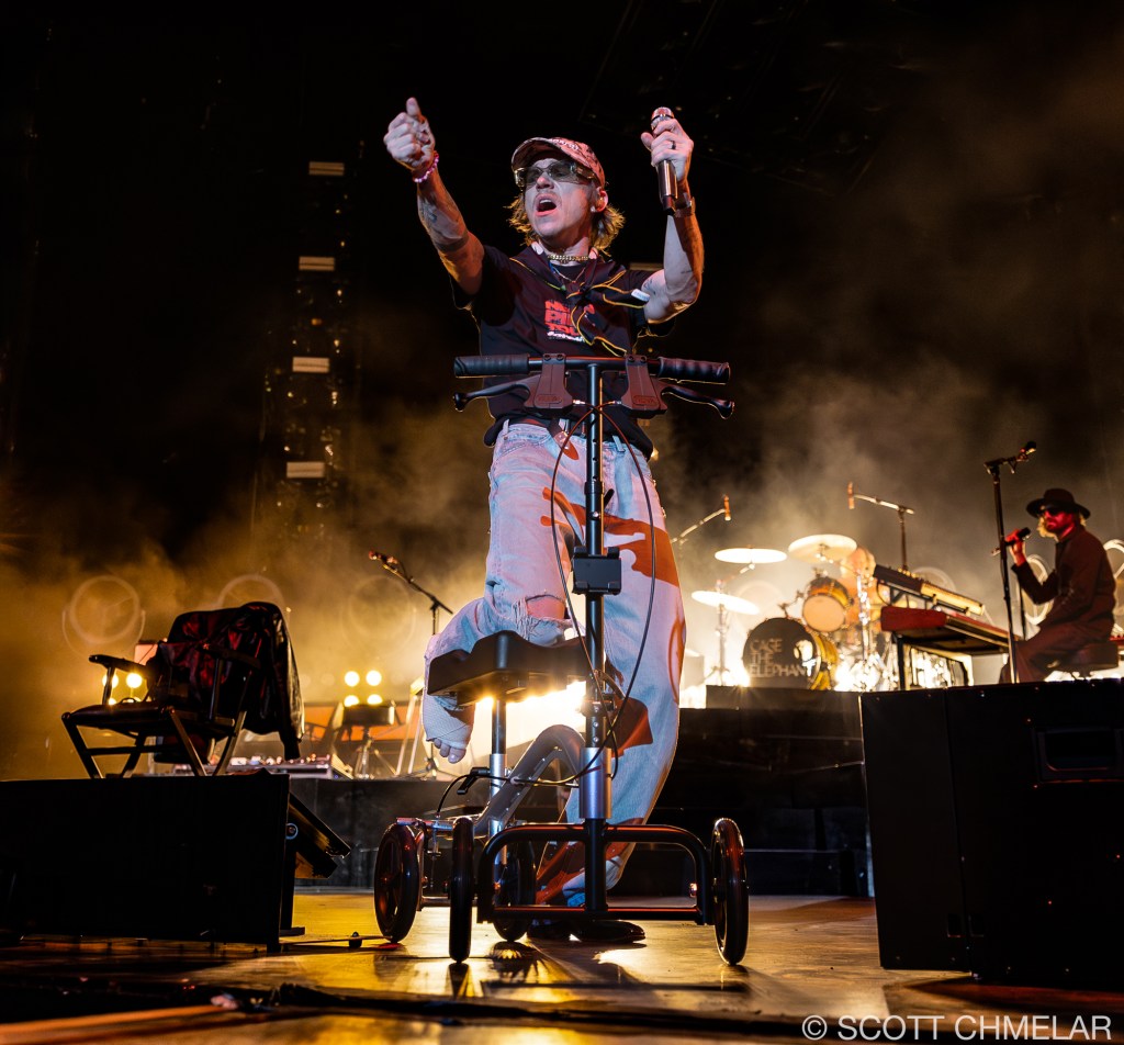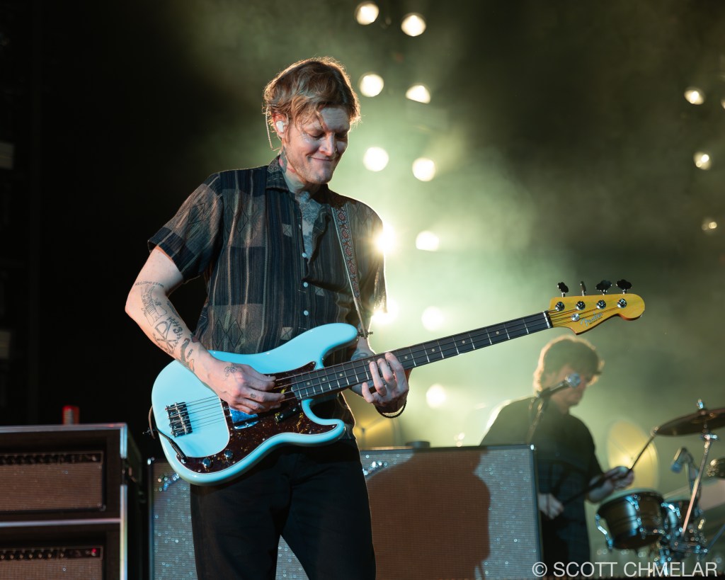 But it was Cage the Elephant, hailing from Bowling Green, Kentucky, that truly electrified the crowd. Frontman Matt Shultz, despite having broken his foot just the night before during an energetic performance in Charlotte, NC, wasn’t going to let a little thing like a busted limb stop him. He had a misstep while bounding across the stage at the Charlotte Metro Credit Union Amphitheatre, causing a nasty fall that left him with a fractured foot. Yet, as the lights dimmed and the band took the stage, Matt, clad in a protective boot, hobbled out with the same wild energy fans had come to expect. The band—comprising Brad Shultz, Nick Bockrath, Daniel Tichenor, Jared Champion, and Matthan Minster—tore through tracks from their latest album, Social Cues, like men possessed, with Matt’s injury adding an extra layer of raw grit to their already powerful performance.