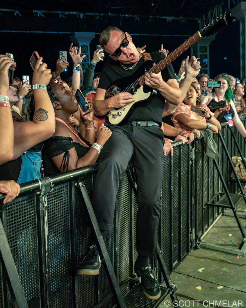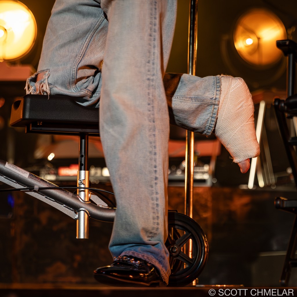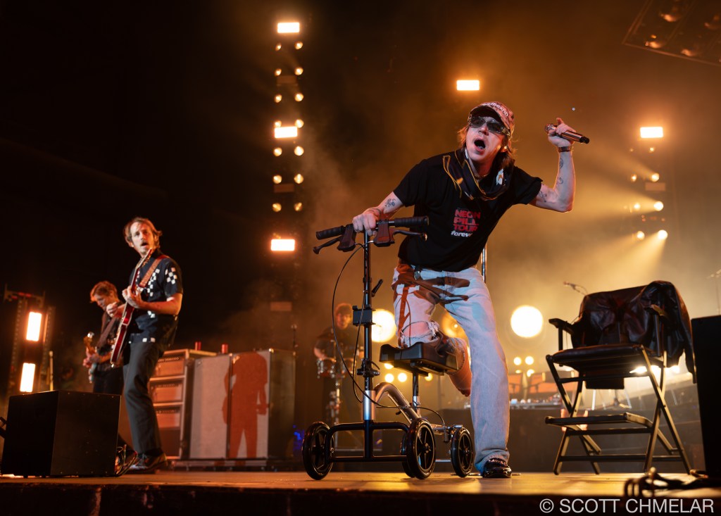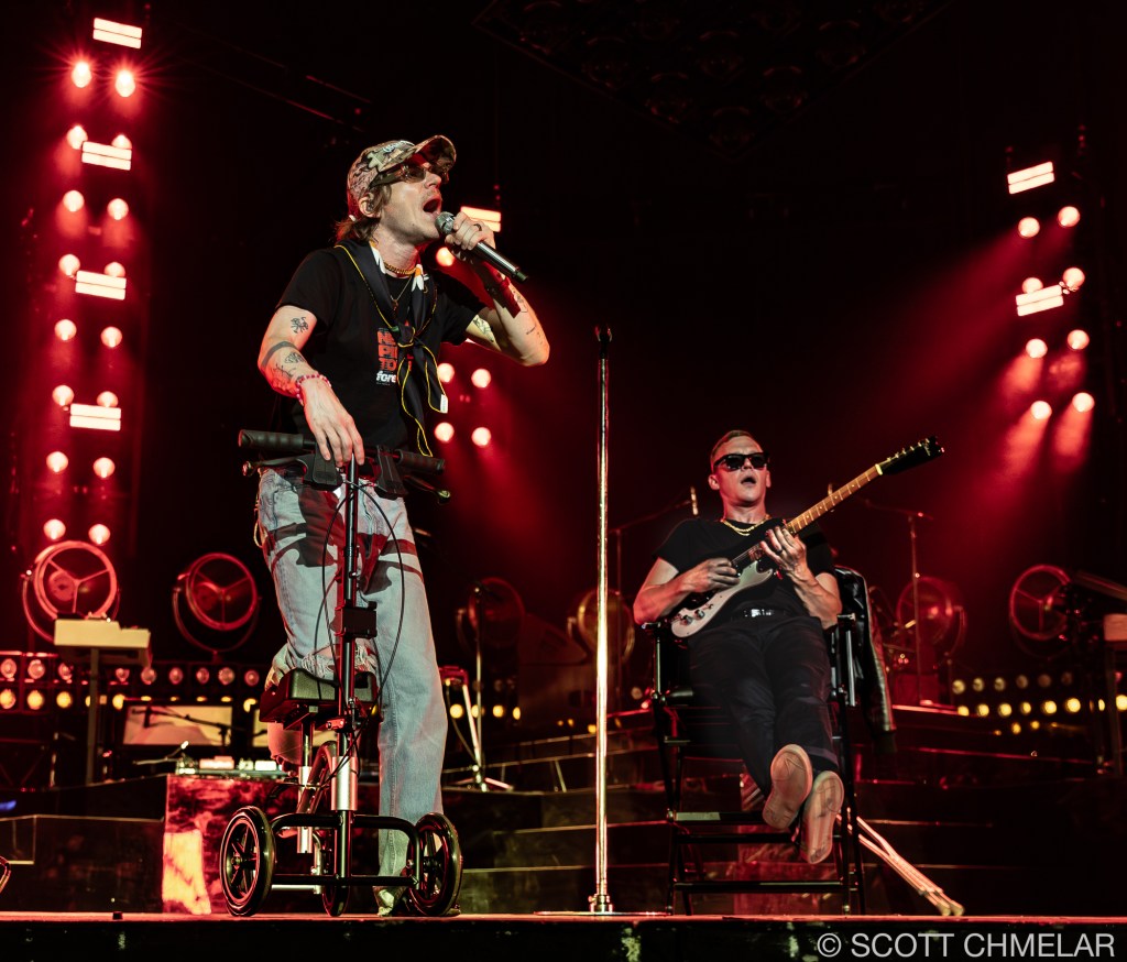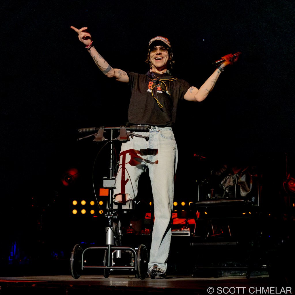 But it was Cage the Elephant, hailing from Bowling Green, Kentucky, that truly electrified the crowd. Frontman Matt Shultz, despite having broken his foot just the night before during an energetic performance in Charlotte, NC, wasn’t going to let a little thing like a busted limb stop him. He had a misstep while bounding across the stage at the Charlotte Metro Credit Union Amphitheatre, causing a nasty fall that left him with a fractured foot. Yet, as the lights dimmed and the band took the stage, Matt, clad in a protective boot, hobbled out with the same wild energy fans had come to expect. The band—comprising Brad Shultz, Nick Bockrath, Daniel Tichenor, Jared Champion, and Matthan Minster—tore through tracks from their latest album, Social Cues, like men possessed, with Matt’s injury adding an extra layer of raw grit to their already powerful performance.