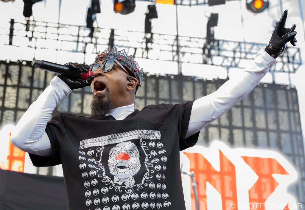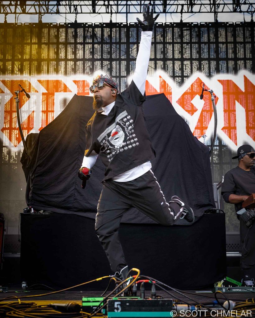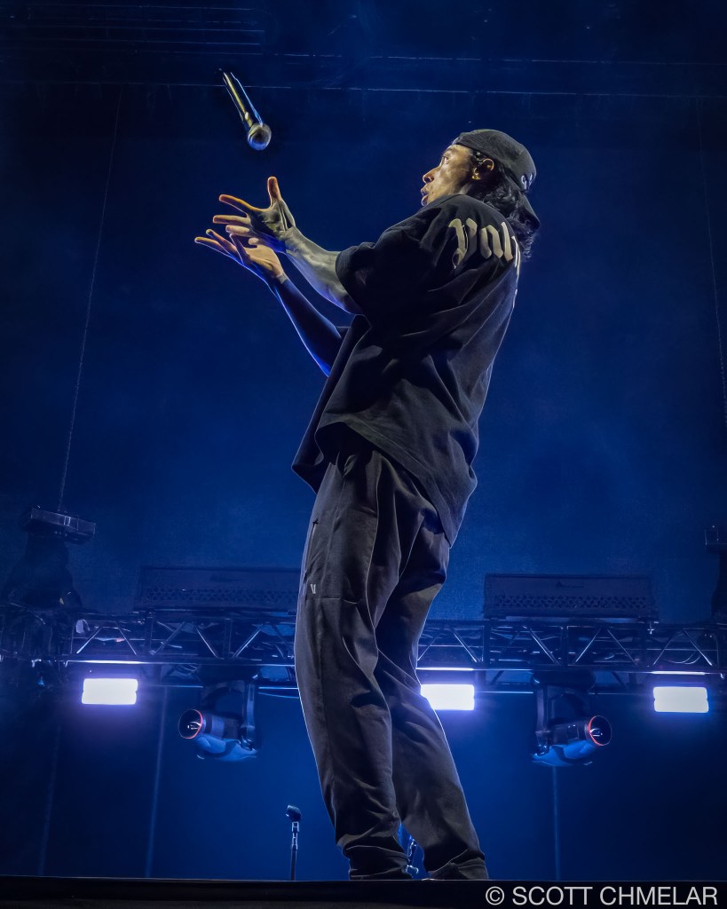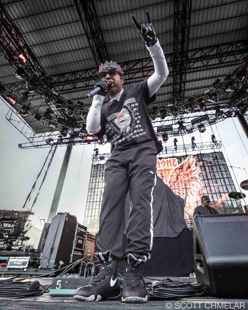 Next up was Tech N9ne (strangemusicinc.net), the independent king from Kansas City. No filler in his set—just rapid-fire bars from a catalog that includes Anghellic (2001), K.O.D. (2009), and ASIN9NE (2021). He’s released more than 20 albums, and the years have only sharpened his delivery. He controlled the stage without needing to oversell anything. His gear booth looked like a red-and-black war zone, full of heavyweight hoodies, Strange Music symbols, and enough graphic tees to outfit a whole underground scene.