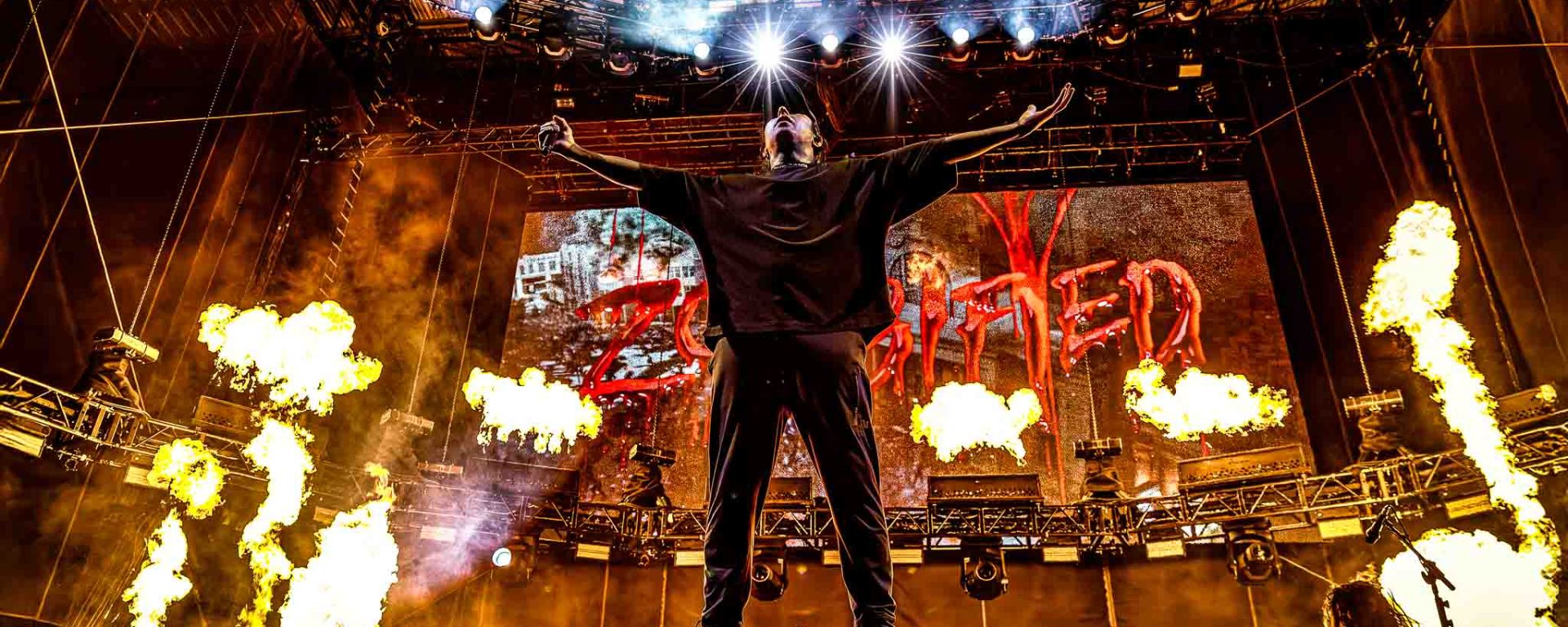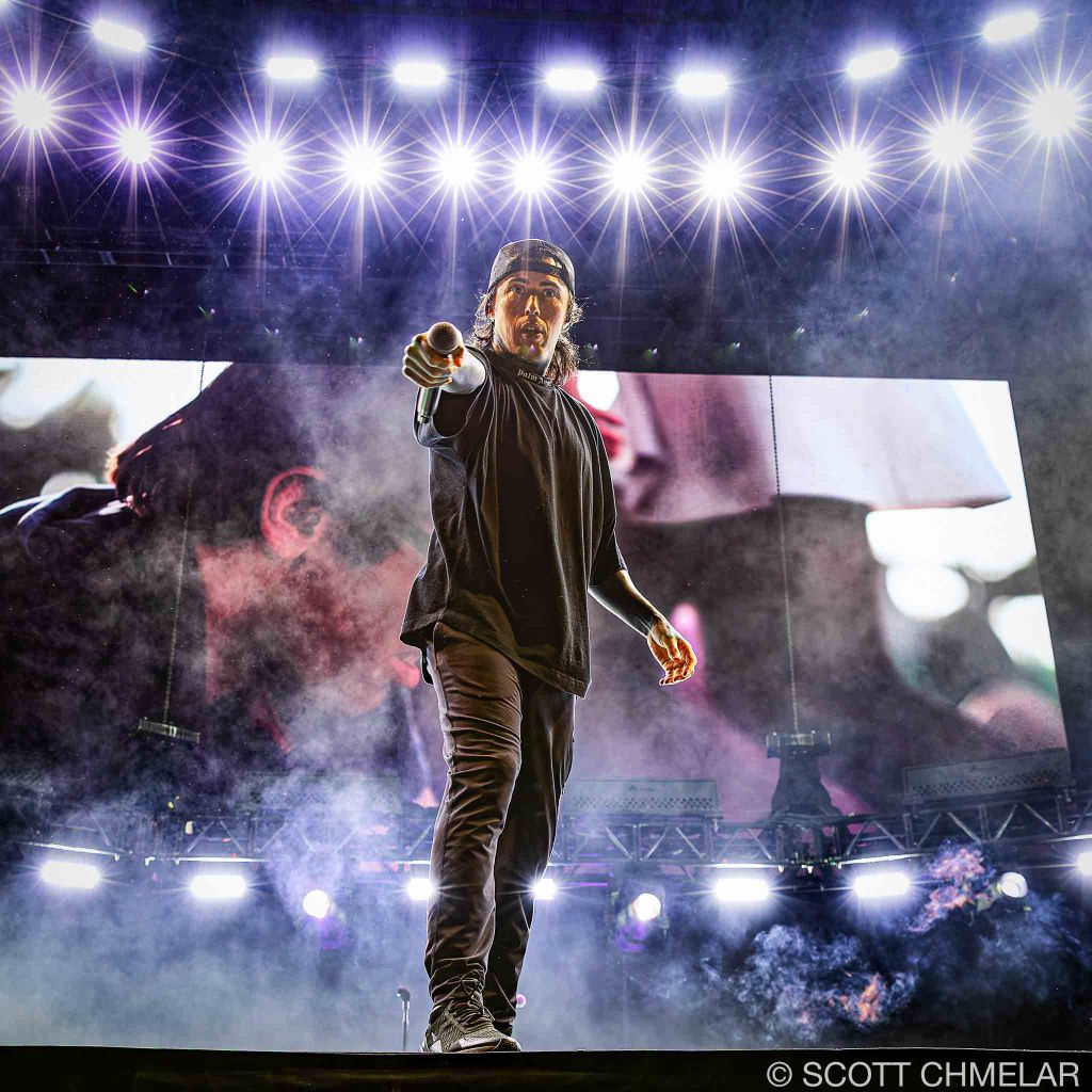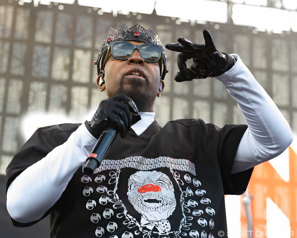 Next up was Tech N9ne (strangemusicinc.net), the independent king from Kansas City. No filler in his set—just rapid-fire bars from a catalog that includes Anghellic (2001), K.O.D. (2009), and ASIN9NE (2021). He’s released more than 20 albums, and the years have only sharpened his delivery. He controlled the stage without needing to oversell anything. His gear booth looked like a red-and-black war zone, full of heavyweight hoodies, Strange Music symbols, and enough graphic tees to outfit a whole underground scene.