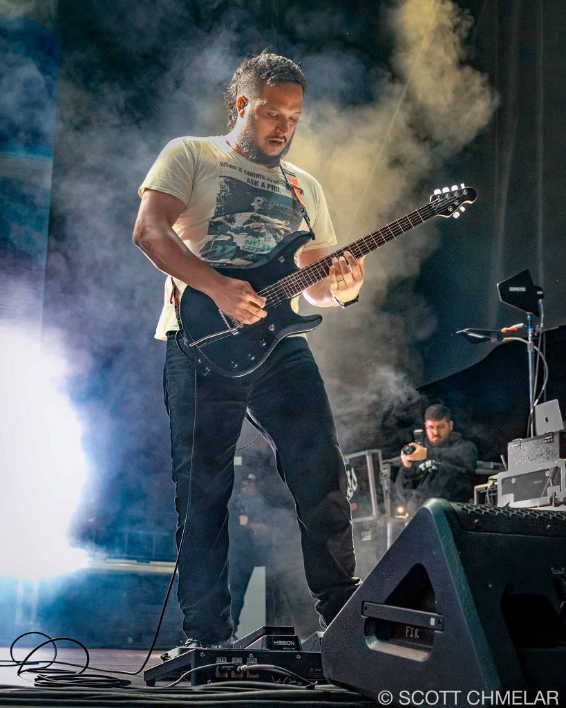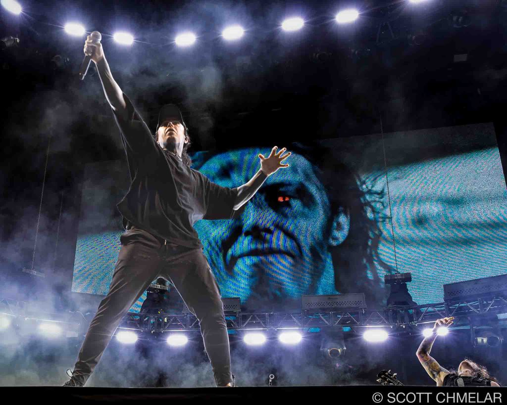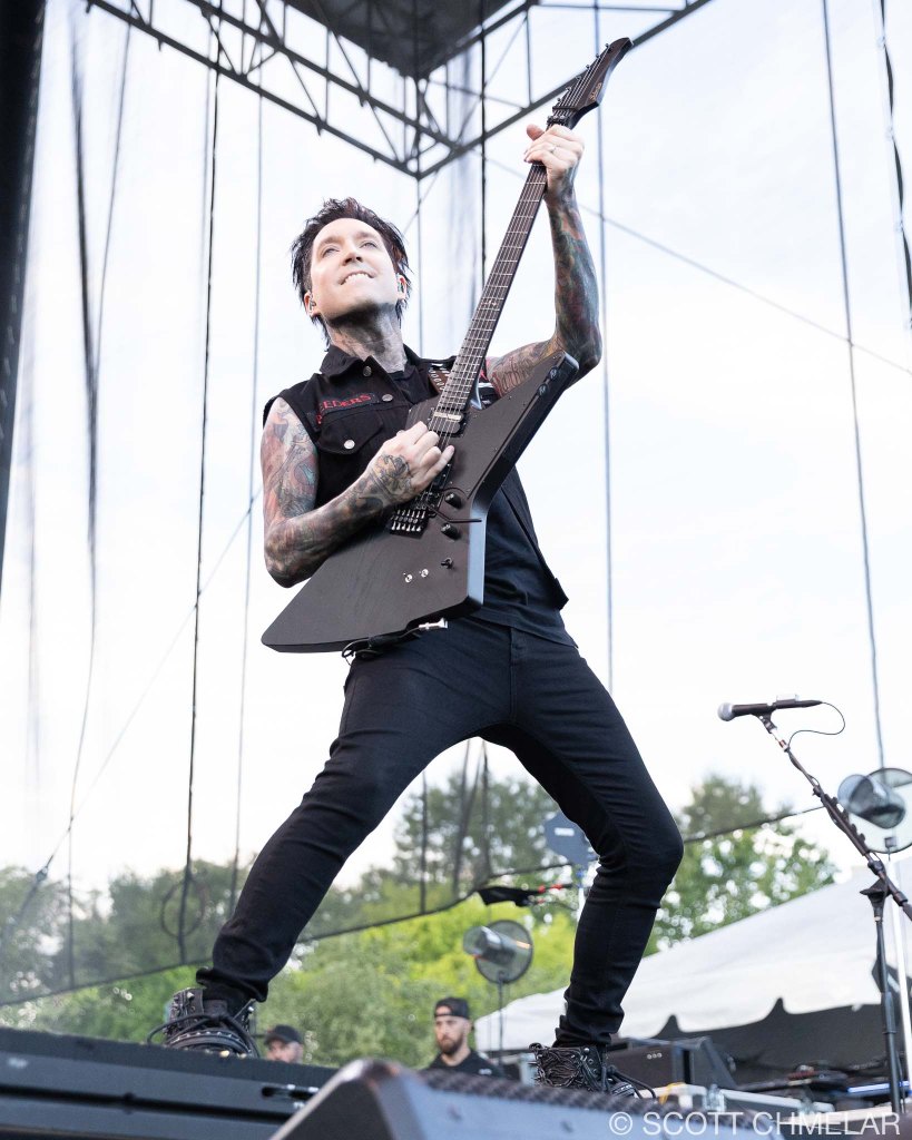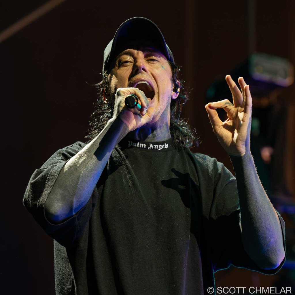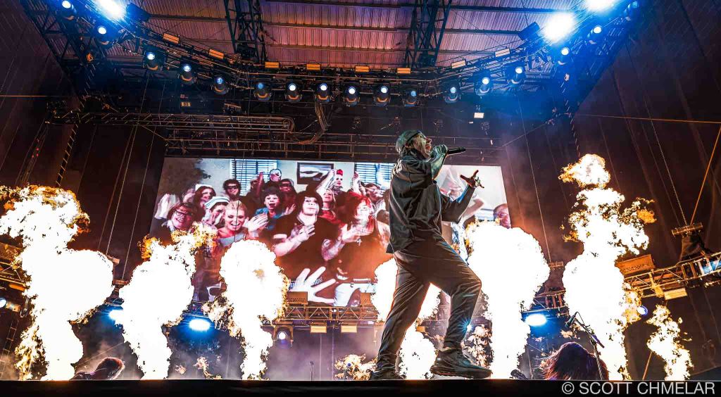 Headlining the night was Falling in Reverse (fallinginreverse.com), from Las Vegas, Nevada. Ronnie Radke fronted the band with the kind of control you don’t fake. Backed by Max Georgiev (lead guitar), Christian Thompson (rhythm guitar), Tyler Burgess (bass), and Luke Holland (drums), they played a tight, heavy set built around The Drug in Me Is You (2011), Just Like You (2015), Coming Home (2017), and Popular Monster (2024). Their use of pyro was over the top in the best way—waves of fire timed perfectly to breakdowns and choruses. The crowd screamed every word back. Their merch tent looked like a battlefield: blacked-out clothing, oversized prints, and fans grabbing everything they could before it sold out.