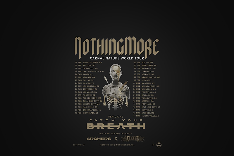 On January 16, 2026, The Ritz in Raleigh, NC, will host a powerhouse lineup headlined by Nothing More, with support from Catch Your Breath, Archers, and Doobie. Nothing More, known for their fusion of alternative rock, progressive metal, and electronic elements, brings their intense live performance and thought-provoking lyrics to the stage. Their latest album, Carnal, released on June 28, 2024, showcases their most focused and adventurous music to date, featuring tracks like “If It Doesn’t Hurt” that highlight their dynamic range and emotional depth . For more information and tour dates, visit their official website: nothingmore.net.