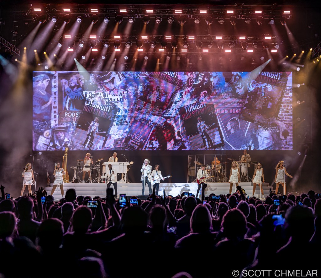 Born in Highgate, London, Rod Stewart leads a dynamic and seasoned band featuring Don Kirkpatrick (lead guitar), Emerson Swinford (rhythm guitar), Conrad Korsch (bass), Jay Davis (backup vocals, bass), and Calvin Smith (drums). Equally essential to the energy of the performance were the powerhouse female vocalists and multi-instrumentalists—Becca Kotte, Holly Brewer, and Joanne Harper among them—who not only provided soaring harmonies and duets, but also brought choreographed dance numbers and standout vocal showcases. Violinist and mandolin player J’Anna Jacoby added a textured, folk-rock element to key songs. Their show-stopping renditions of “I’m Every Woman” and “Lady Marmalade” brought the crowd to its feet, delivering an ensemble experience that matched Stewart’s star power with musicality and style.