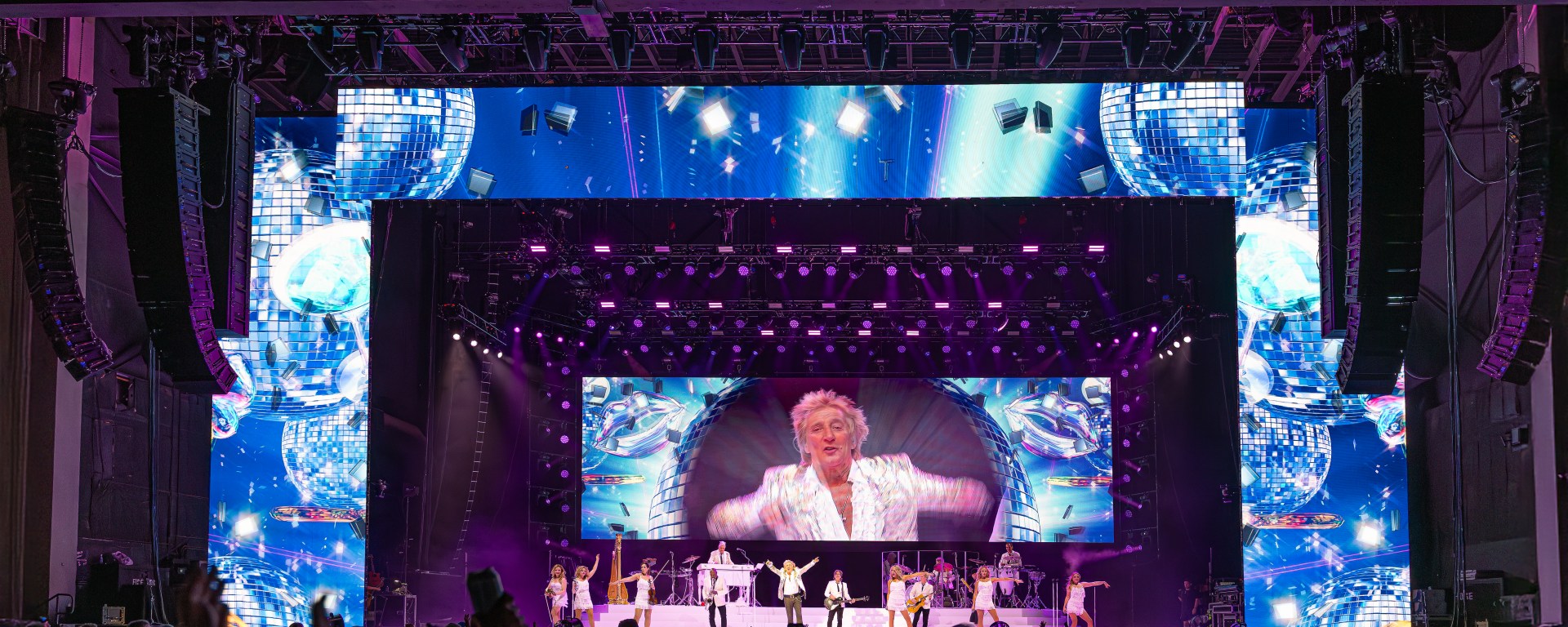 The stage visuals were bold and immersive—LED walls, quick-change risers, and fluid lighting design executed by Patrick Woodroffe with production by Cosmo Wilson, while Triad Staging handled stage construction. Steve Kempster ran front-of-house audio, delivering a perfectly tuned mix that gave each element of the show—from harmonies to harp solos—its due presence. Behind the scenes, Stewart kept the spirit loose but focused: personally reviewing setlists, swapping stories with the crew, and working closely with longtime costume designer Zoe Ellis, whose sequined jackets, silk shirts, and fitted trousers gave his wardrobe its signature blend of glam and polish.