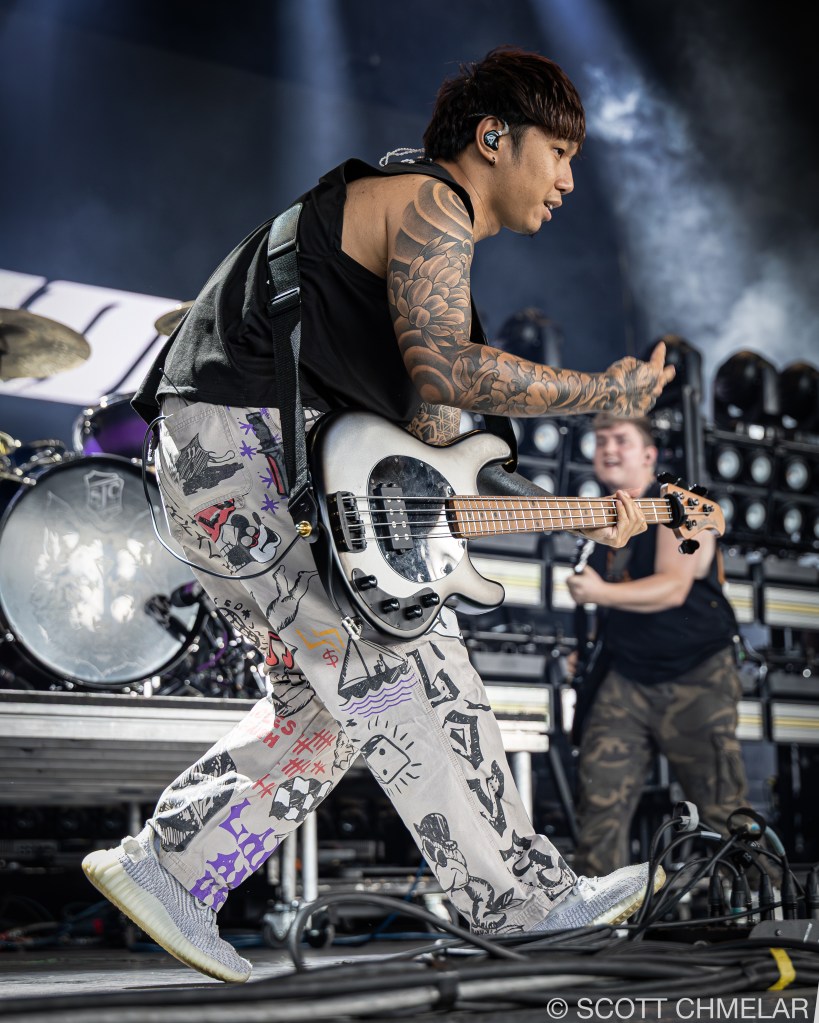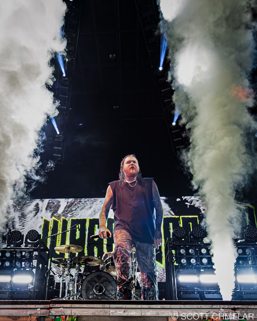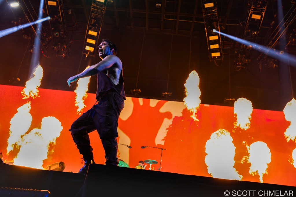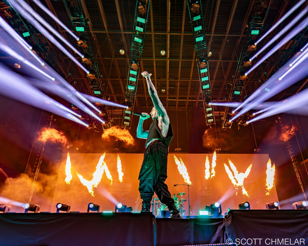 Falling In Reverse ripped through their set at Coastal Credit Union Music Park on August 22, 2025, like they owned every inch of the “God Is A Weapon Tour.” Ronnie Radke (vocals), Christian Thompson (guitar), Marc Okubo (guitar), Luke Holland (drums), and Daniel “DL” Laskiewicz (bass) weren’t just playing songs—they were staging an assault, and the crowd was right there for it. The catalog stretched from The Drug in Me Is You (2011) to Popular Monster(2024), with the 2025 single “God Is A Weapon” detonating like it was written for this exact moment. Fire, sparks, and pyrotechnics went off in sync with every big hit, giving the fans in face paint and ripped merch something to scream about. Falling In Reverse are on Epitaph Records, certified, charting, and still pushing buttons. The merch line was chaos—hoodies, box sets, vinyl, and shirts being snatched up like contraband. Official website: https://fallinginreverse.com.