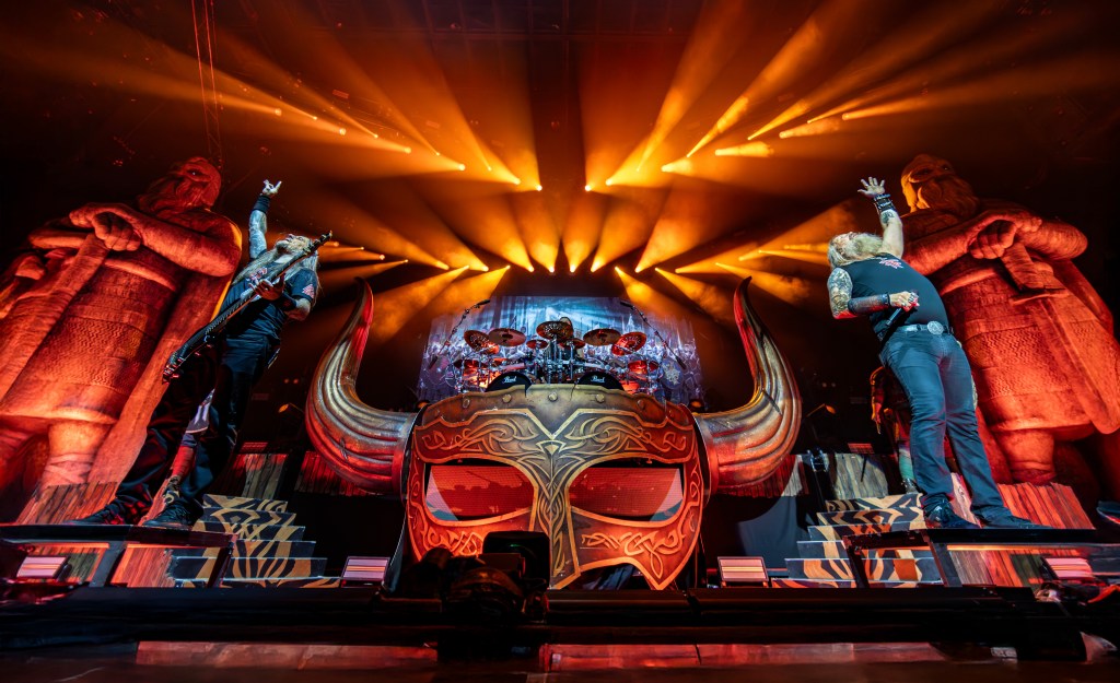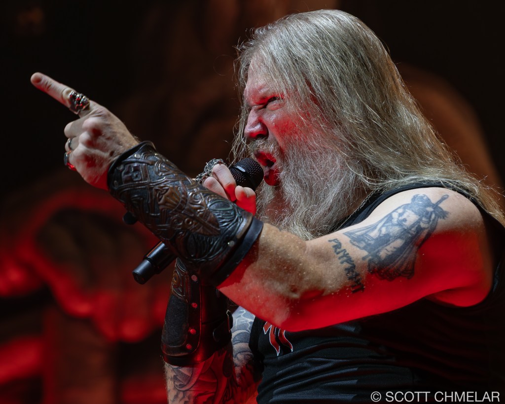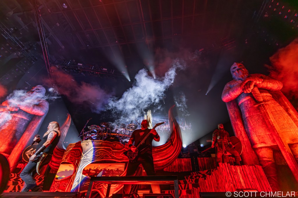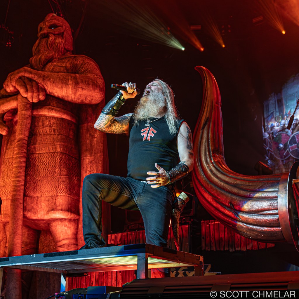 Amon Amarth, stepping in as support, turned the amphitheater into their own battlefield. Viking statues framed the stage, smoke cannons fired in bursts, and Johan Hegg led the charge like a general rallying his troops. Behind him, Ted Lundström, Olavi Mikkonen, Johan Söderberg, and Jocke Wallgren kept everything sharp, heavy, and locked in. Songs from The Great Heathen Army (2022) and the fresh single “We Rule the Waves” landed hard, while old warhorses like “Twilight of the Thunder God” and “The Pursuit of Vikings” turned the crowd into a chanting army. Their discography now stretches across a dozen records on Metal Blade, each one expanding their world of myth and steel, and the merch booth leaned into it—horns, hoodies, and limited-edition posters snapped up quickly. Amon Amarth has stacked up festival headlines and high-charting albums across Europe and the U.S., and Raleigh gave them the kind of response that suggests the States might finally be catching up. Their official site is Amon Amarth.