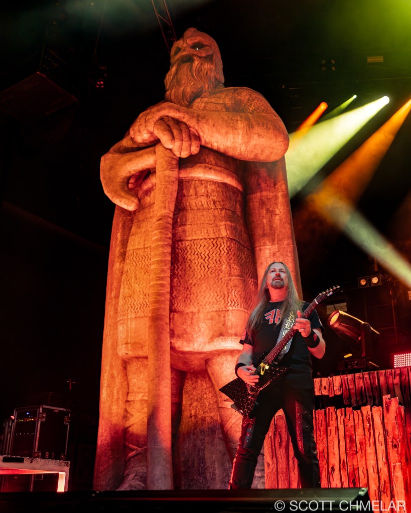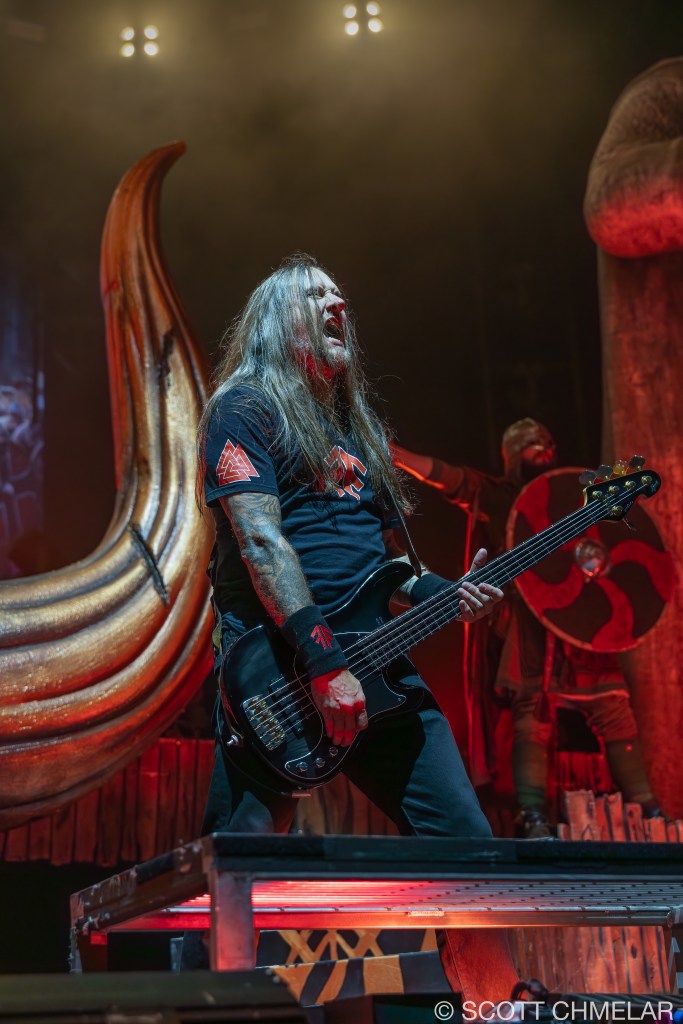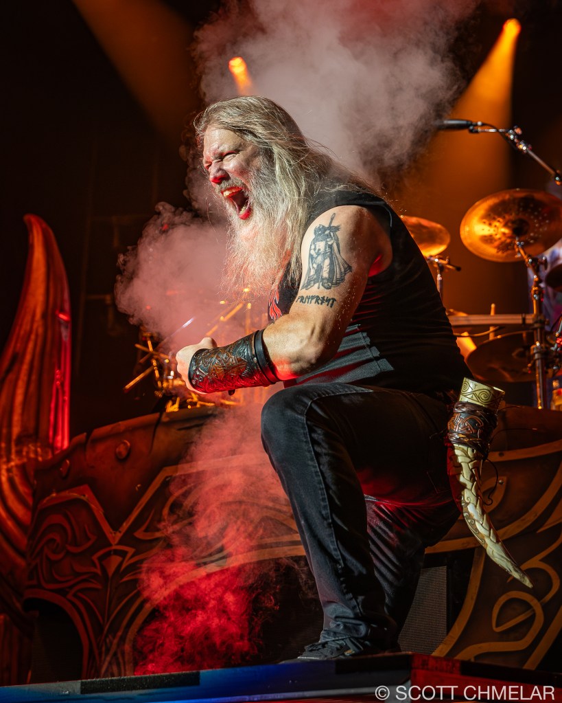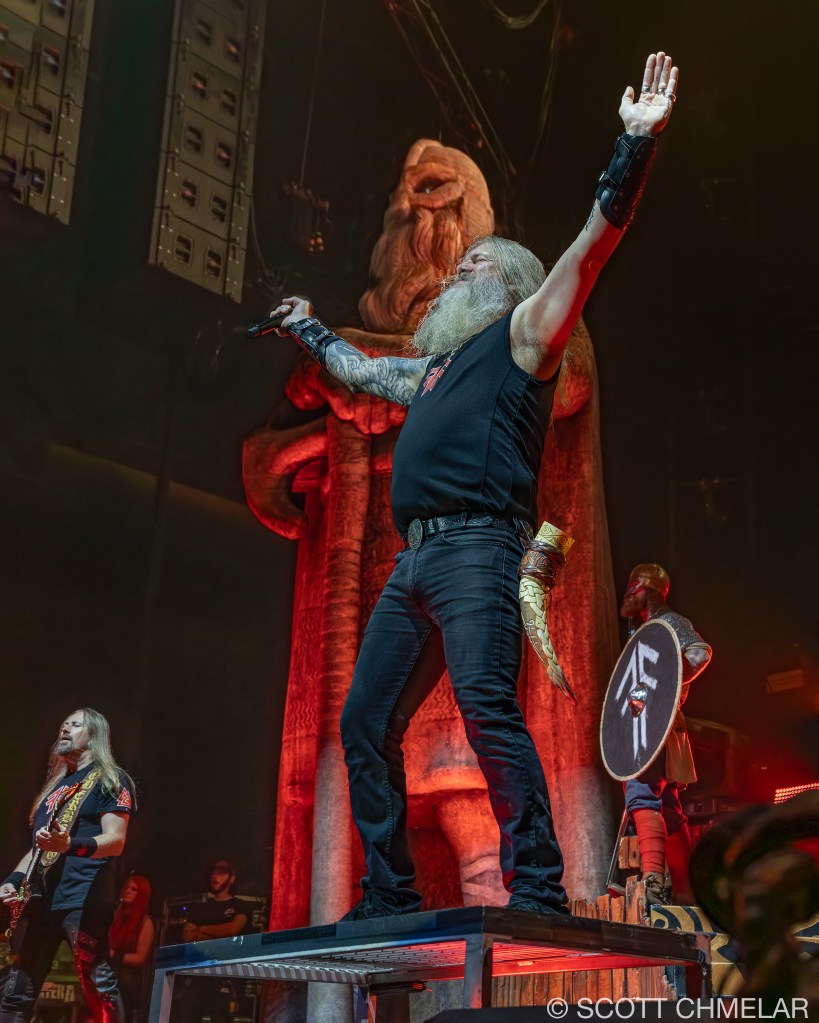 Amon Amarth, stepping in as support, turned the amphitheater into their own battlefield. Viking statues framed the stage, smoke cannons fired in bursts, and Johan Hegg led the charge like a general rallying his troops. Behind him, Ted Lundström, Olavi Mikkonen, Johan Söderberg, and Jocke Wallgren kept everything sharp, heavy, and locked in. Songs from The Great Heathen Army (2022) and the fresh single “We Rule the Waves” landed hard, while old warhorses like “Twilight of the Thunder God” and “The Pursuit of Vikings” turned the crowd into a chanting army. Their discography now stretches across a dozen records on Metal Blade, each one expanding their world of myth and steel, and the merch booth leaned into it—horns, hoodies, and limited-edition posters snapped up quickly. Amon Amarth has stacked up festival headlines and high-charting albums across Europe and the U.S., and Raleigh gave them the kind of response that suggests the States might finally be catching up. Their official site is Amon Amarth.