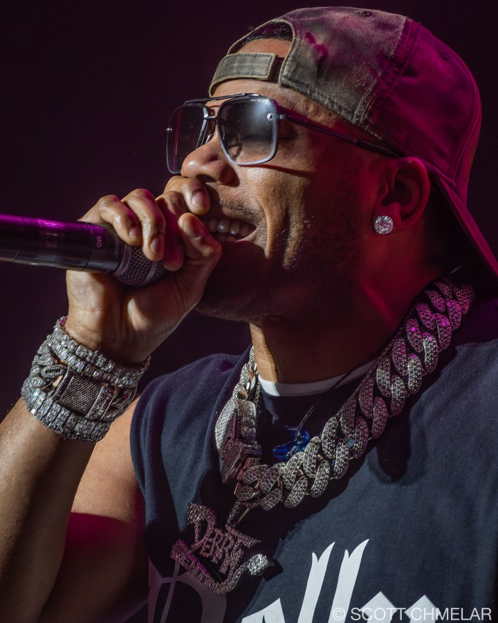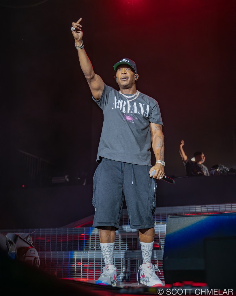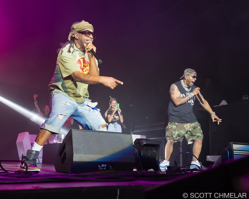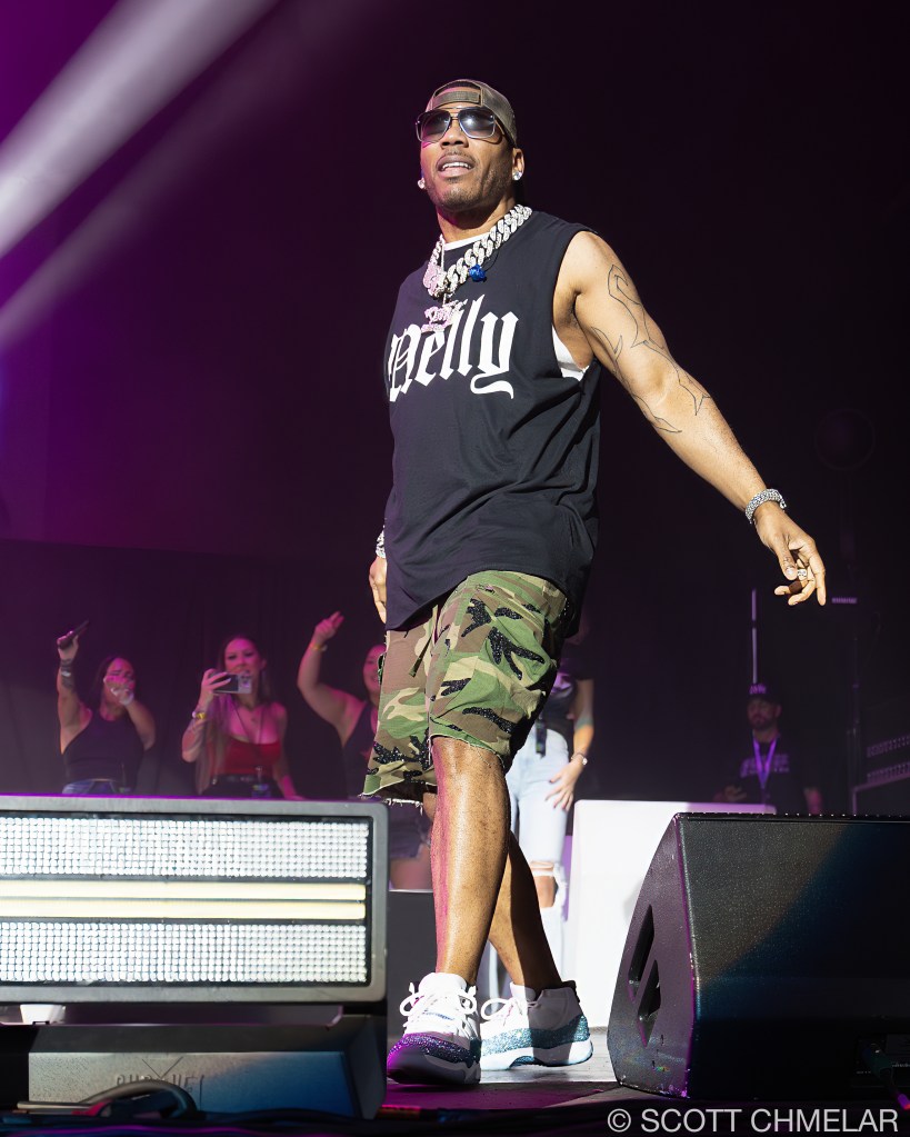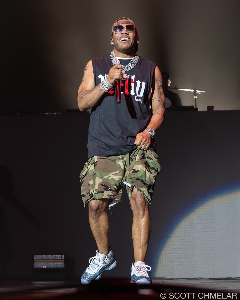 When Nelly took over, the show intensified. His opening was choreographed — dancers came out in sync, going through routines that framed Nelly’s entrance. He started with high-energy tracks and quickly moved into a collaboration with St. Lunatics midway through his set, bringing them out for joint performances of tracks like “Ride wit Me”, “Air Force Ones” and “Flap Your Wings”. The dance moves were tight; Nelly doesn’t rely solely on choreography but uses movement, crowd interaction, stepping off the stage edge, encouraging sing-alongs. The visual production ramped up: larger video screens played crisp images of the performers, sometimes cuts to archival footage; lighting rigs shifted between bright white for impactful moments and rich colored washes during choruses. The crowd was deeply responsive — by the time Nelly and St. Lunatics were performing together, people were on their feet, calling out lyrics, waving phones, dancing in aisles. His merch was plentiful: hoodies, limited tour jackets, deluxe bundles including posters and signed memorabilia, plus standard t-shirts. Nelly, with diamond album Country Grammar, platinum records including Nellyville and Suit, and numerous Billboard and Grammy awards, has expanded into business and philanthropy, supporting education and health initiatives. His latest release is Heartland. More about Nelly can be found at https://www.nelly.net.