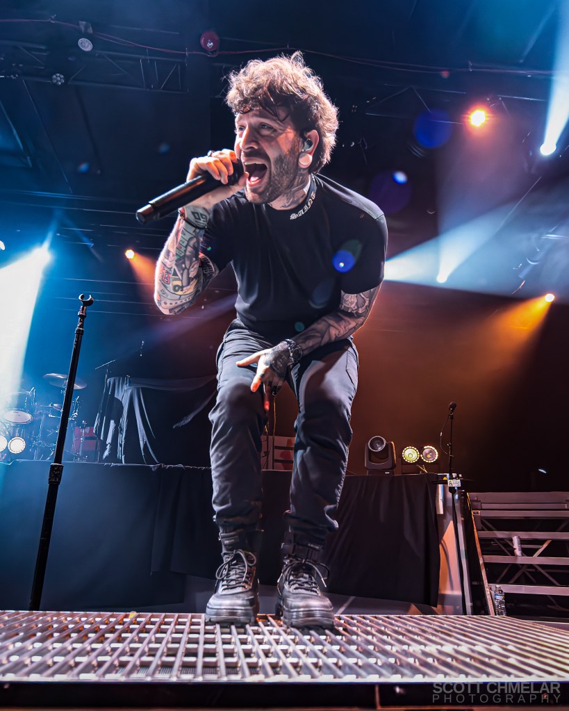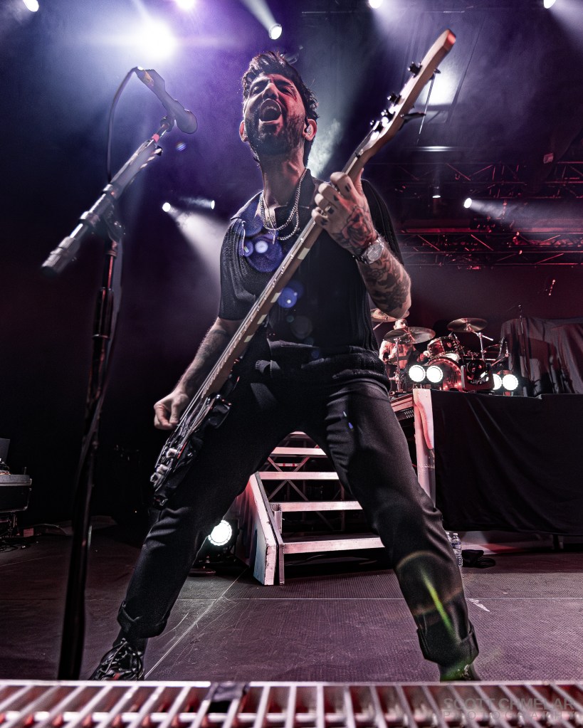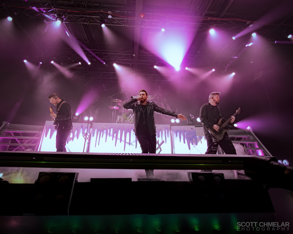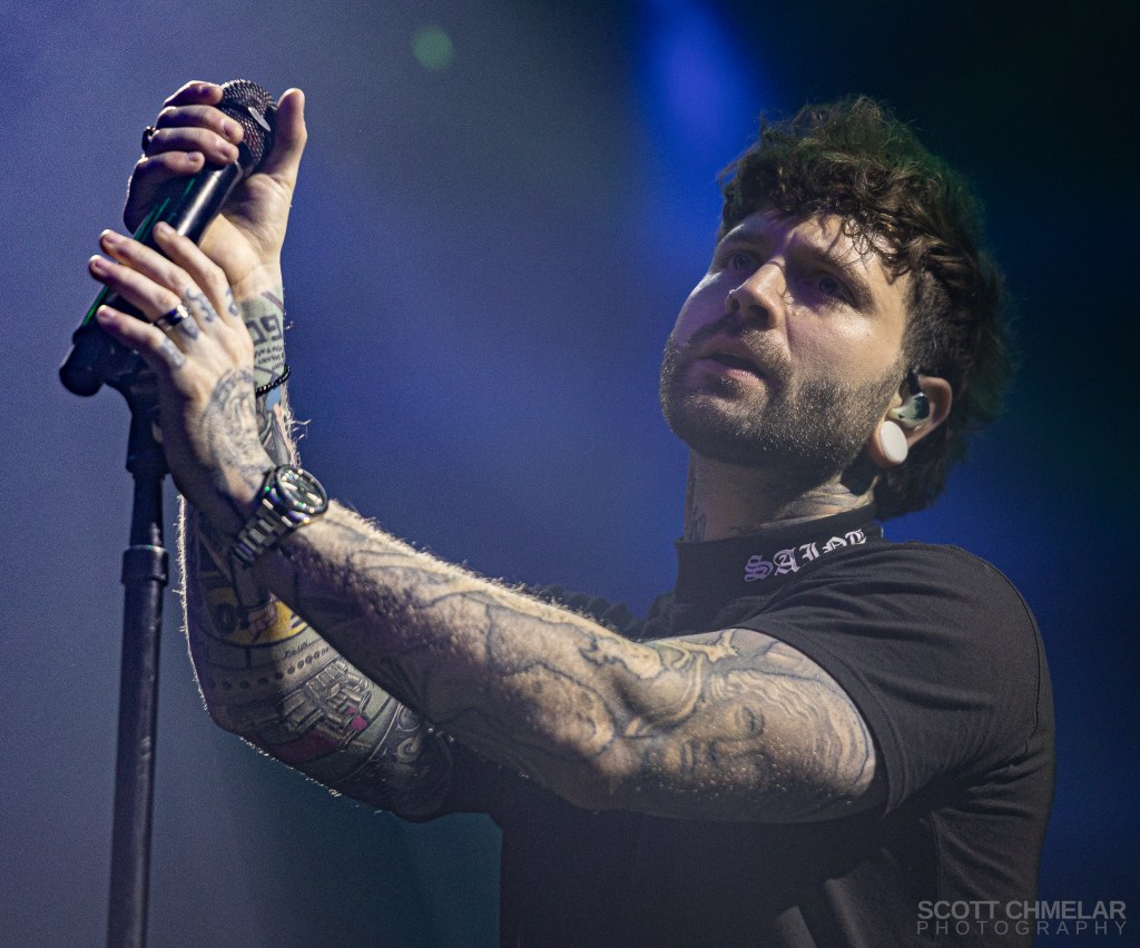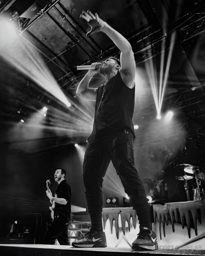 Fame On Fire, supporting the tour, continued to affirm their rise within modern hard rock. Originating in Palm Beach, Florida in 2013, the band transitioned from viral reinterpretations into a fully realized original act with albums including Levels, Welcome to the Chaos, The Death Card, and Chains. Their catalog reflects a blend of metal, hard rock, and alternative influences, released independently after earlier label partnerships. In Raleigh, their set was direct and forceful, with crisp rhythmic execution and a vocal delivery that stayed controlled while maintaining intensity. The crowd responded with visible movement and vocal participation, particularly during newer material. Their production leaned into darker lighting palettes and sharp transitions, supporting the band’s heavier aesthetic while remaining consistent with the tour’s overall visual presentation. Merchandise included album-era designs, hoodies, and signed items tied to recent releases. Official website: https://fameonfireband.com